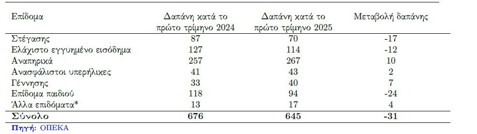 Κατά το πρώτο τρίμηνο του 2025 ο ΟΠΕΚΑ κατέβαλε 645 εκατ. ευρώ, μειώνοντας τη δαπάνη για επιδόματα κατά 31 εκατ. ευρώ σε σύγκριση με την αντίστοιχη περίοδο του 2024. Η μεγαλύτερη αύξηση στη δαπάνη παρατηρείται στα αναπηρικά επιδόματα (κατά 10 εκατ. ευρώ), η οποία συνοδεύεται από αύξηση του αριθμού των δικαιούχων κατά 8.819, συγκρίνοντας τον μέσο όρο των δικαιούχων του 2025 με την αντίστοιχη περίοδο του προηγούμενου έτους.