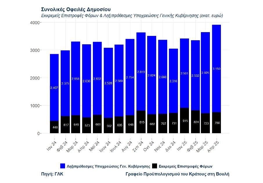 Τον Απρίλιο του 2025 καταγράφηκε αύξηση των συνολικών ληξιπρόθεσμων υποχρεώσεων του Δημοσίου κατά 863 εκατ. ευρώ σε σύγκριση με το Δεκέμβριο του 2024. Ειδικότερα, οι ληξιπρόθεσμες οφειλές αυξήθηκαν κατά 834 εκατ. ευρώ 12 φτάνοντας τα 3.150 εκατ. ευρώ και οι εκκρεμείς επιστροφές φόρων αυξήθηκαν κατά 29 εκατ. ευρώ φτάνοντας τα 760 εκατ. ευρώ.