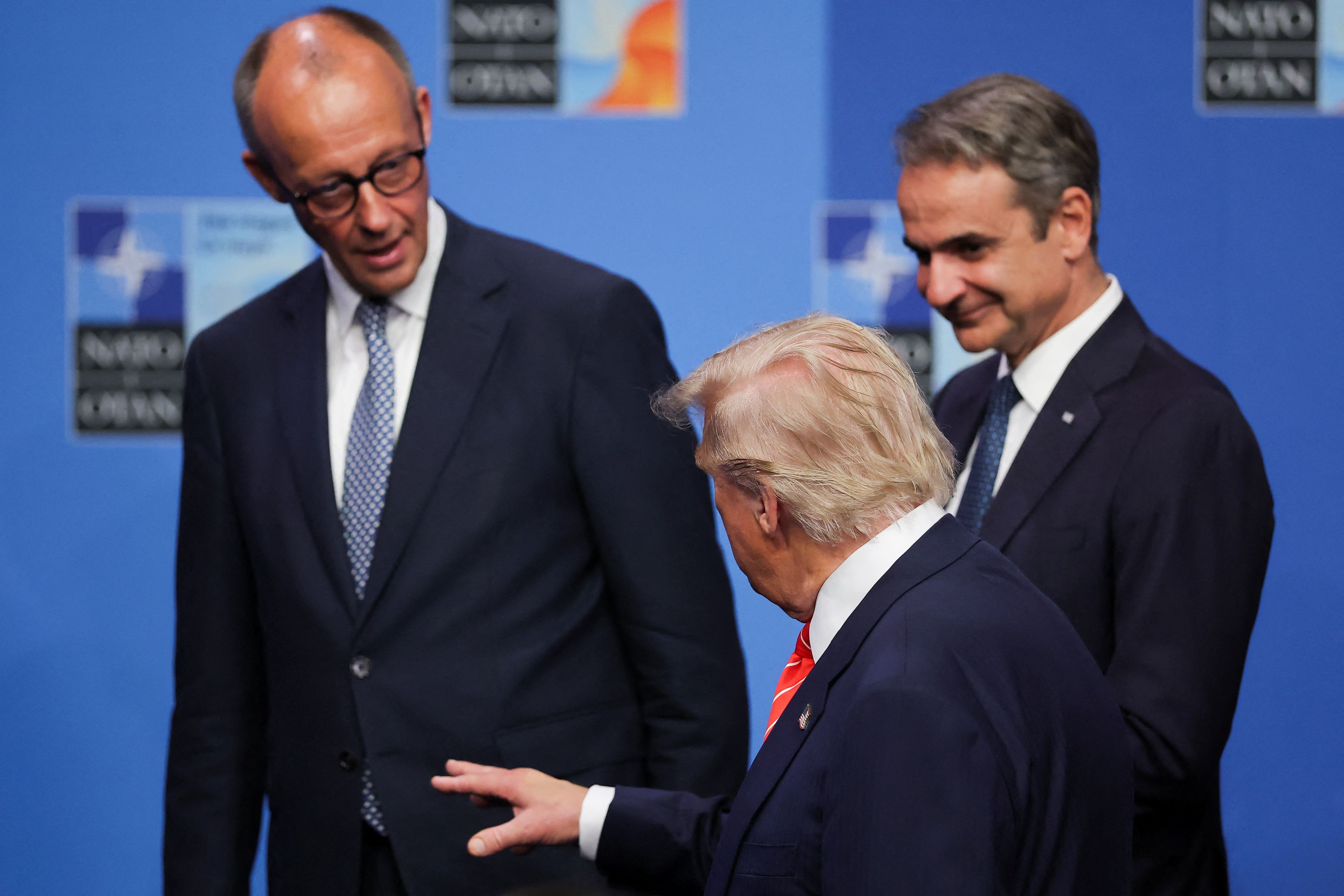 Ο Ντόναλντ Τραμπ συνομιλεί με τον Καγκελάριο της Γερμανίας Φρίντριχ Μερτς και ο Έλληνας πρωθυπουργός Κυριάκος Μητσοτάκης… πιστός ακόλουθος