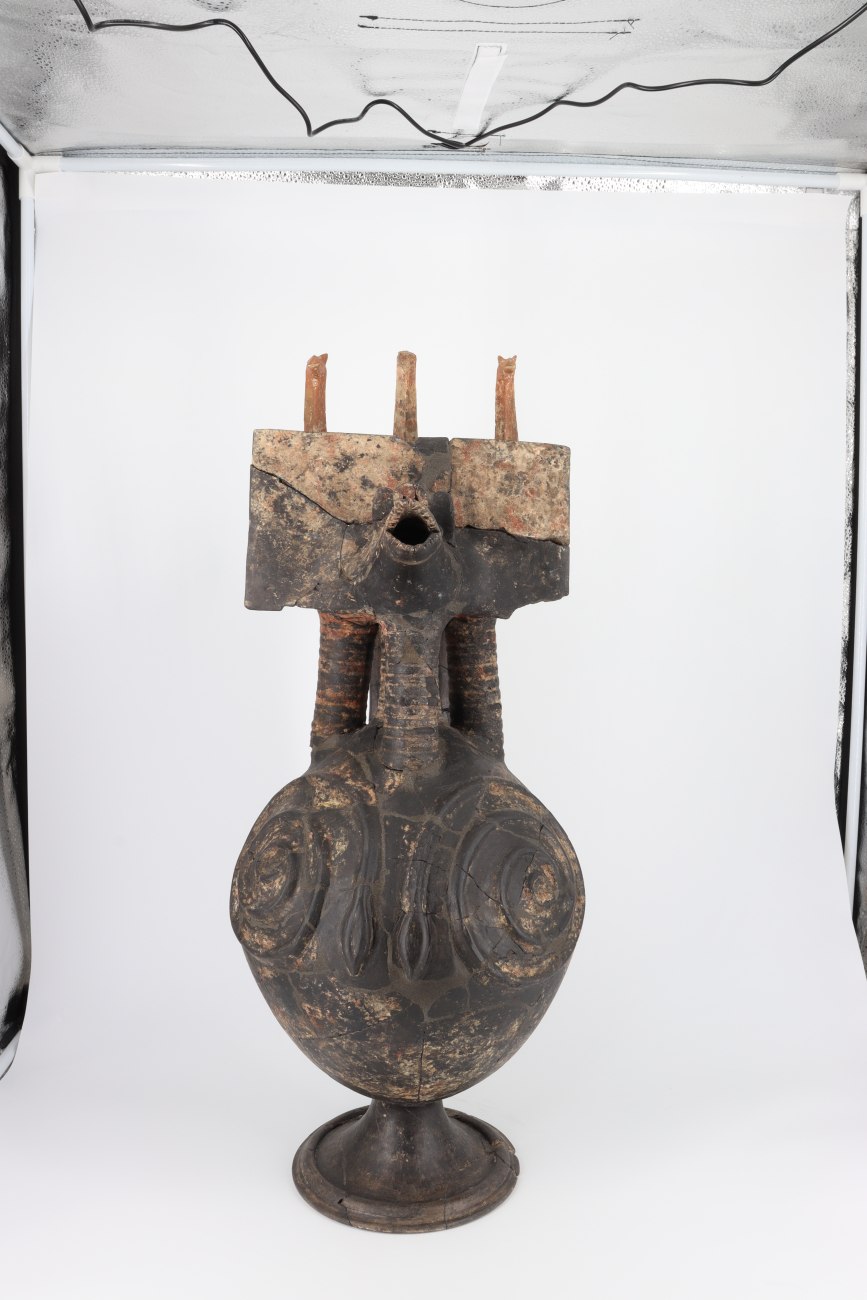 Ωστόσο στην απόληξη του ετρουσκικού αγγειοστάτη ως “λαλούντα σύμβολα” απεικονίζονται κεφαλές κρανοφόρων νεαρών πολεμιστών που δηλώνουν παραστατικά για το ποιοί χρησιμοποιούσαν τον αγγειοστάτη.