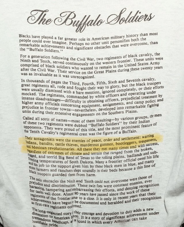 «Το πρόβλημα είναι ότι οι Buffalo Soldiers συμμετείχαν κυριολεκτικά όχι μόνο στην καθιέρωση του έθνους των ΗΠΑ, αλλά και σε μια γενοκτονία!» προσθέτει.