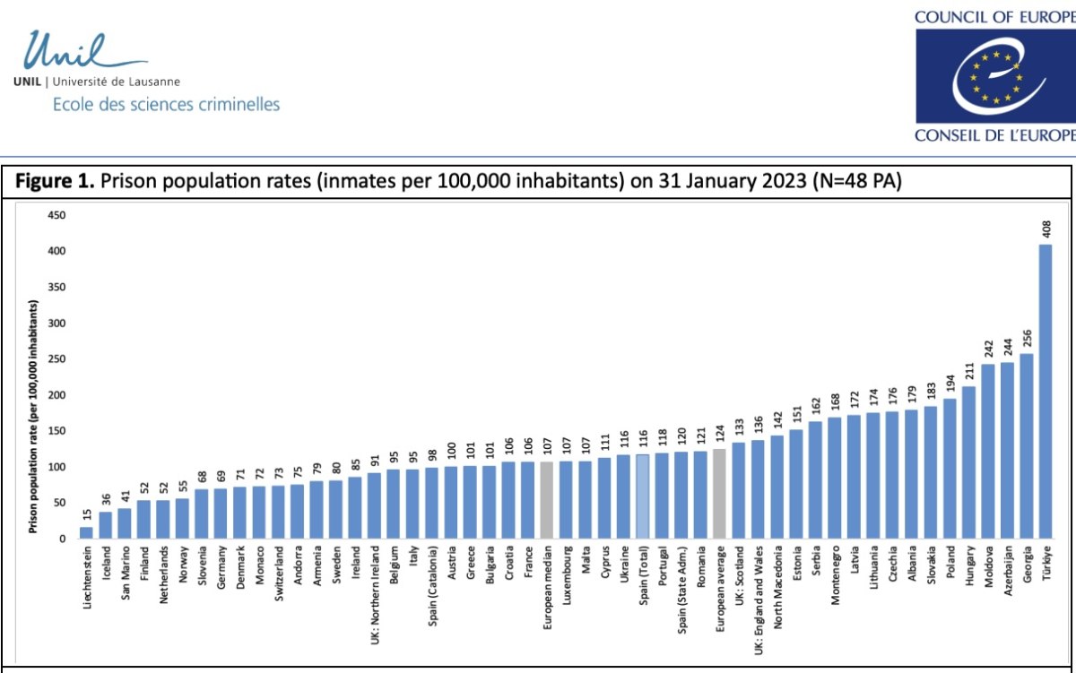 Η Τουρκία κατέχει τα «μαύρα» πρωτεία στους κόλπους του Συμβουλίου της Ευρώπης σε αναλογία αριθμού κρατουμένων ανά 100.000 κατοίκους (Πηγή: Συμβούλιο της Ευρώπης, Πανεπιστήμιο της Λοζάνης)