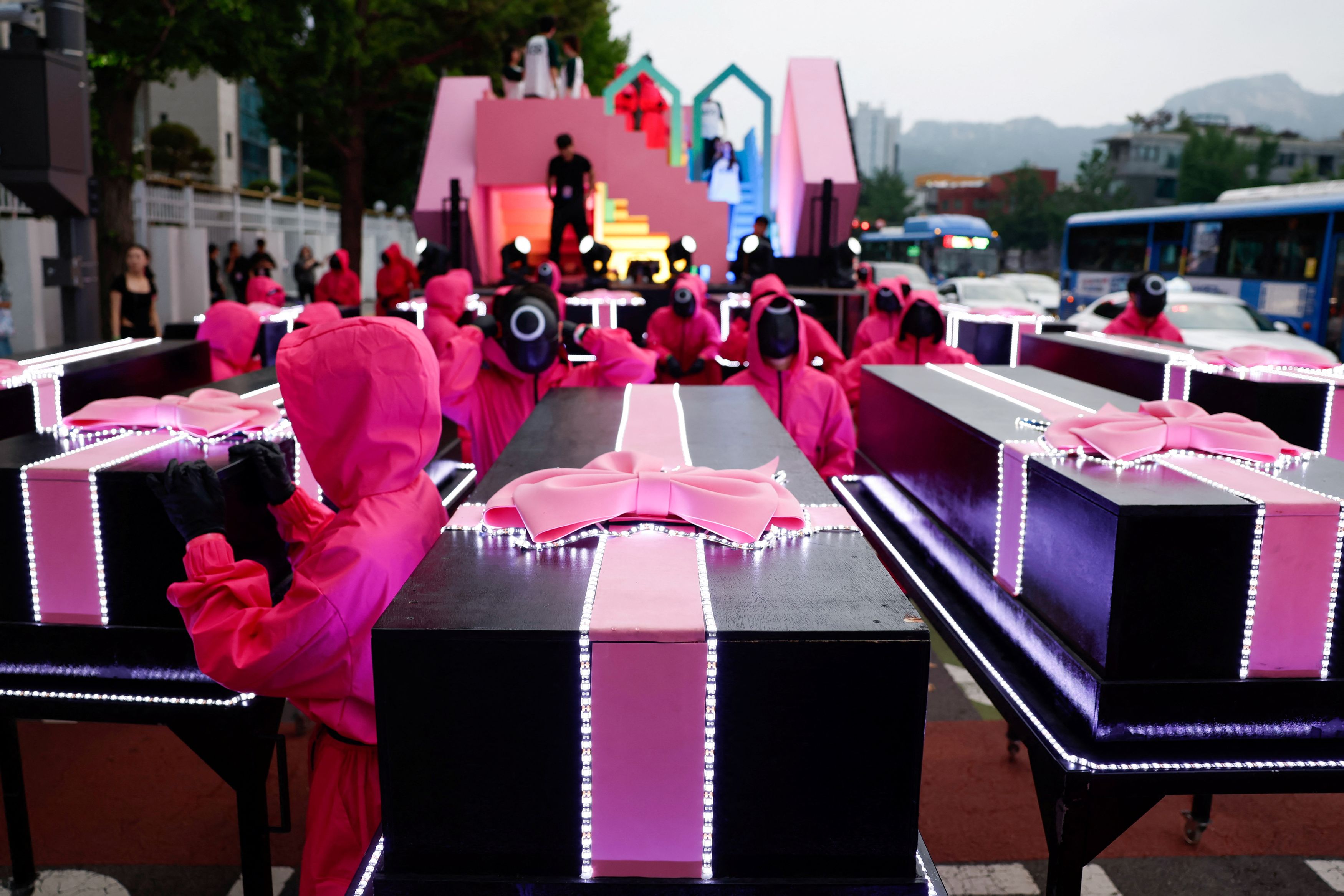 Τα πιο δυστοπικά μηνύματα της σειράς παραμερίστηκαν το Σάββατο το βράδυ, καθώς μια τεράστια παρέλαση γιόρτασε την κυκλοφορία της τελευταίας σεζόν του μπλοκμπάστερ. Μια γιγάντια κούκλα-δολοφόνος και δεκάδες φρουροί με φόρμες – μεταξύ άλλων μοτίβων των θανατηφόρων παιχνιδιών – παρήλασαν στην κεντρική Σεούλ με μεγάλη επισημότητα.