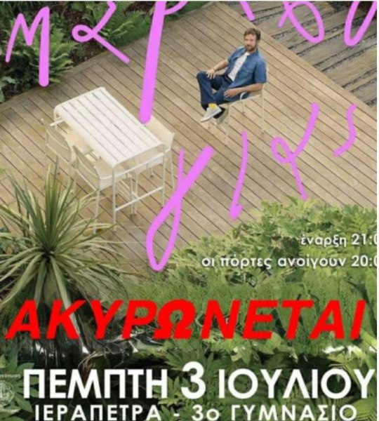 Ακυρώθηκε η προγραμματισμένη για σήμερα το βράδυ (3 Ιουλίου 2025) συναυλία του Κωστή Μαραβέγια στην Ιεράπετρα, εξαιτίας της μεγάλης φωτιάς που μαίνεται από το απόγευμα της Τετάρτης σε περιοχές του Δήμου.