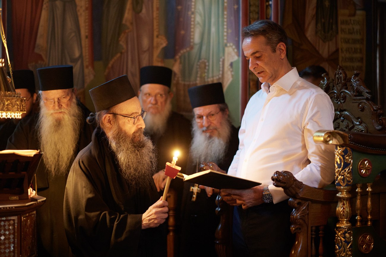 Τη θεία λειτουργία της Ιεράς Μονής Σίμωνος Πέτρας, όπου και διανυκτέρευσε, παρακολούθησε τα ξημερώματα ο πρωθυπουργός, Κυριάκος Μητσοτάκης, συνοδευόμενος από τον γιο του Κωνσταντίνο.