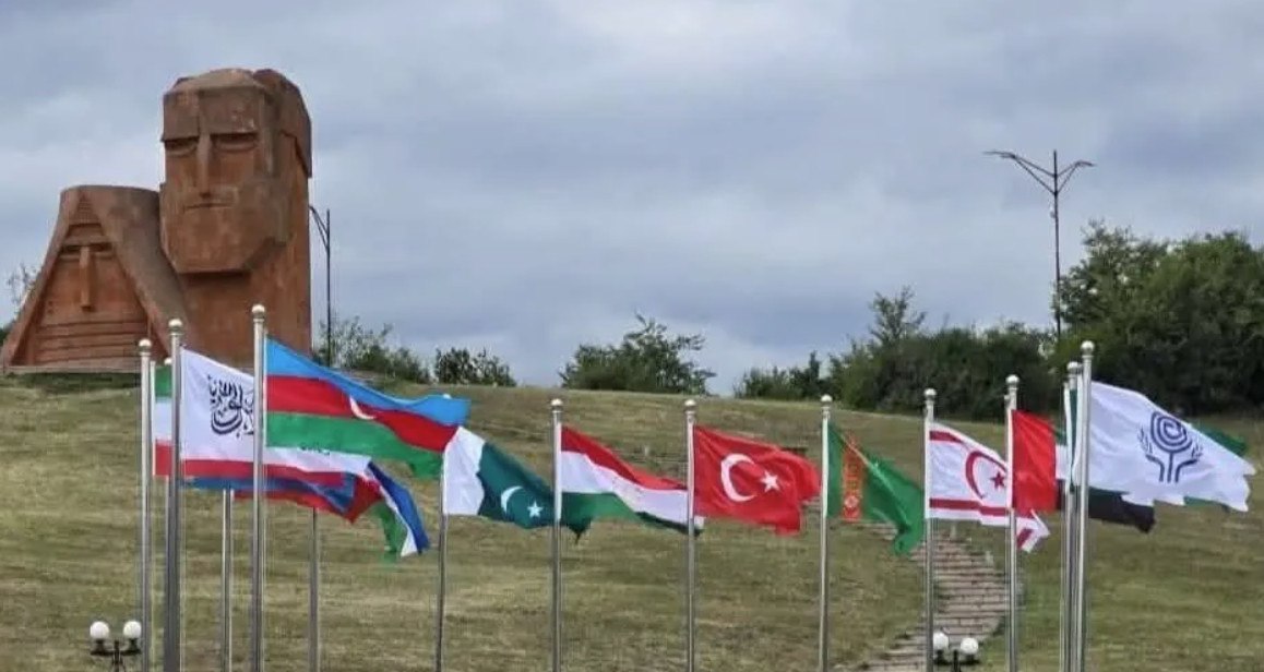 Η σημαία του τουρκοκυπριακού ψευδοκράτους έχει υψωθεί μπροστά από το εμβληματικό αρμενικό μνημείο «Είμαστε τα Βουνά μας» στο Στεπανακέρτ, όπου διεξάγεται η σύνοδος των ηγετών του ΟΟΣ.