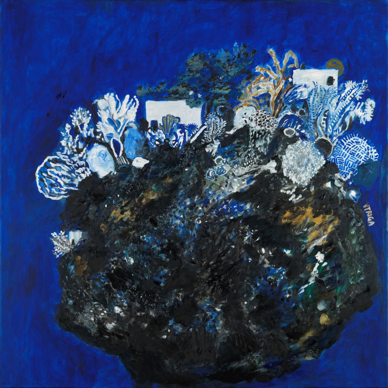 Και προσθέτει:»Ανασκάπτοντας και επινοώντας τους χάρτες και τις γραφές της μαγικής νήσου του μπλε, σμιλεύοντας επιτήδεια τη γενεσιουργό ετούτη θεματική κοιτίδα, μέσα από το πολύτροπο πρίσμα της οποίας μας έχει και στο παρελθόν χαρίσει ευφραντικές οπτικές, αισθητικές και ψυχικές συγκινήσεις, η Βάσω Τρίγκα ζωγραφίζει και πλάθει με τολμηρή δεξιότητα, έξεργη ωριμότητα και αισθαντική απτική δυναμική, έναν υβριδικό κόσμο που γεννιέται ενορατικά, ενορχηστρώνοντας φασματικά φαντασιακά χρωματολόγια, διάφανες ή πηχτές κυανές υδάτινες κοίτες, απάτητα βαθυπράσινα δάση με πλούσια φυλλώματα, περίπτερα, σκιάχτρα και αταύτιστες αχυρένιες φυλές, ανεξερεύνητα κοιτάσματα που αφουγκράζονται το κέντρο της γης, παλίμψηστα γνώριμα και άγνωστα σύμβολα, στιλπνές λάσπες, οργανικές νέες φόρμες, πτερόεντα ίχνη, συλλαβικές αρχετυπικές γραφές και χροιές ενός παλλόμενου χειροποίητου και χειρόγραφου χάρτη του κόσμου.»