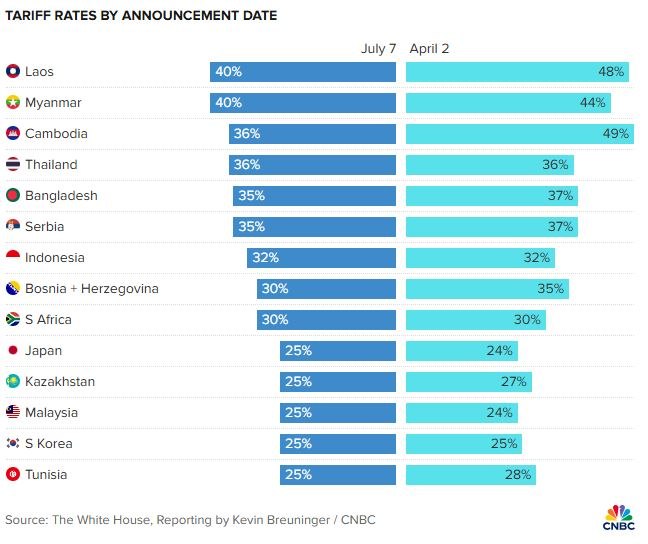 Τα αγαθά που εισάγονται στις ΗΠΑ από την Ιαπωνία, τη Νότια Κορέα, τη Μαλαισία, το Καζακστάν και την Τυνησία πρόκειται τώρα να αντιμετωπίσουν δασμούς 25%, σύμφωνα με τις επιστολές που ανήρτησε ο Τραμπ. Τα αγαθά της Νότιας Αφρικής και της Βοσνίας θα υπόκεινται σε αμερικανικό δασμό 30% και οι εισαγωγές από την Ινδονησία θα πληγούν με ειδικό φόρο κατανάλωσης 32%.