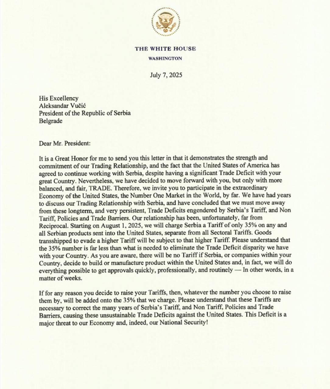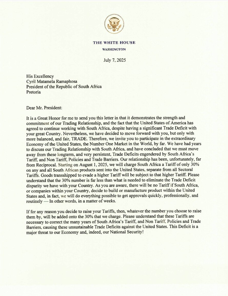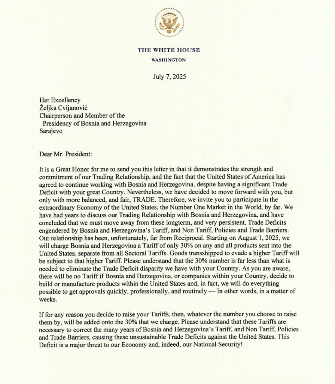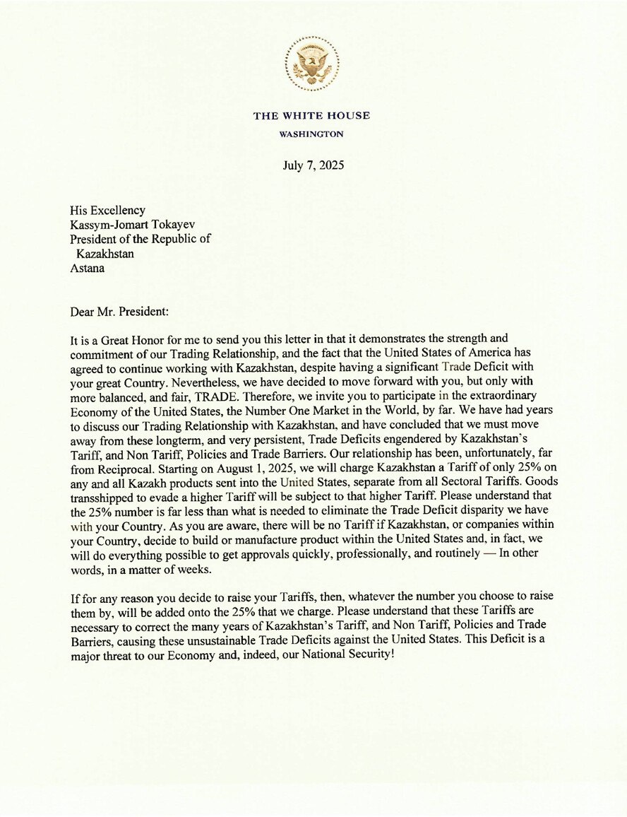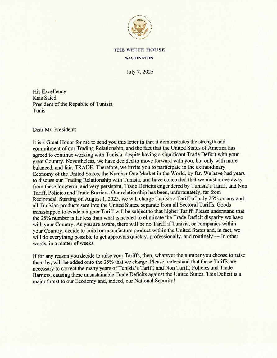Εάν οι χώρες «εξαλείψουν» τις «δασμολογικές και μη δασμολογικές πολιτικές και εμπορικά εμπόδια», τότε οι ΗΠΑ «θα εξετάσουν, ίσως, το ενδεχόμενο προσαρμογής της παρούσας επιστολής», σύμφωνα με τα γραφόμενα.