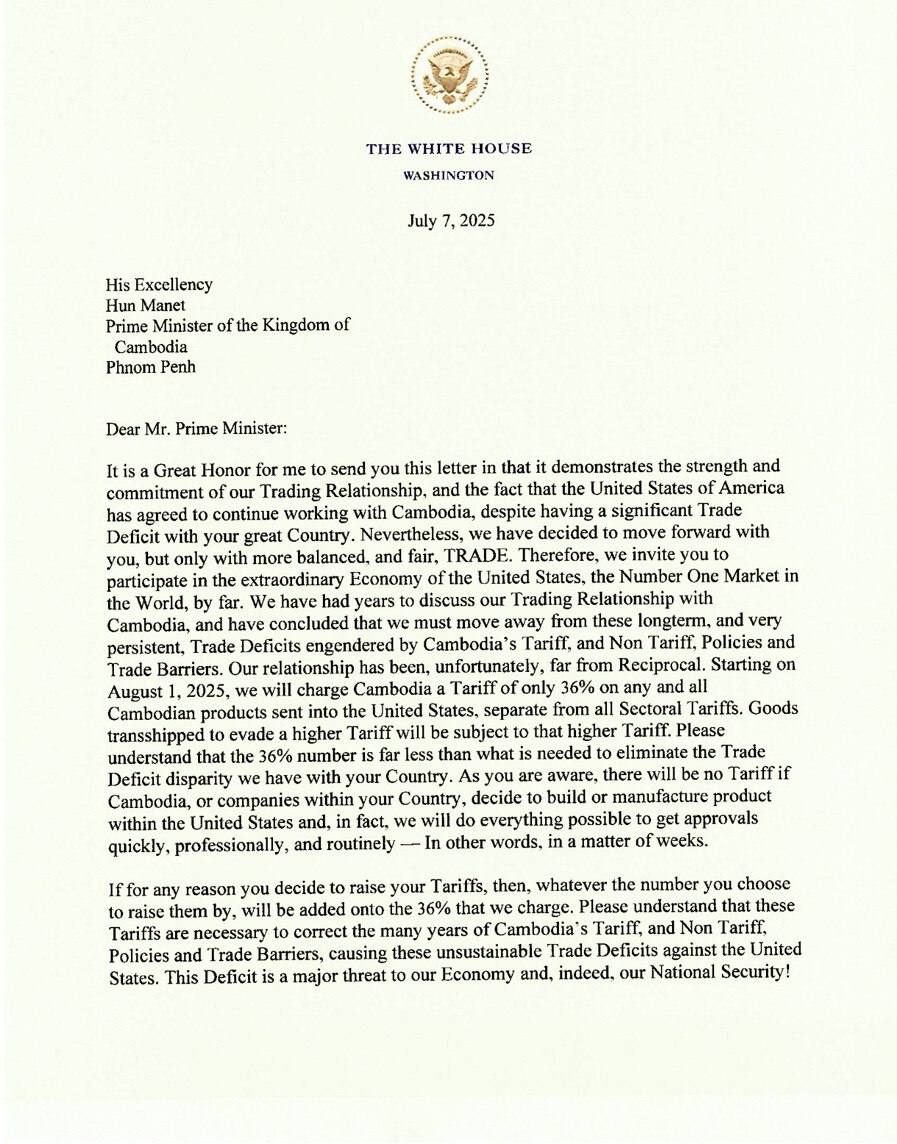 Το Μπανγκλαντές και η Σερβία βρίσκονται στο 35%, ενώ η Καμπότζη και η Ταϊλάνδη θα επιβαρυνθούν με δασμούς 36%, σύμφωνα με τις επιστολές του προέδρου. Οι εισαγωγές από το Λάος και τη Μιανμάρ θα βρεθούν αντιμέτωπες με δασμό 40%, σύμφωνα με τις επιστολές που ανήρτησε ο Τραμπ στο Truth Social, την πλατφόρμα ιδιοκτησίας του.