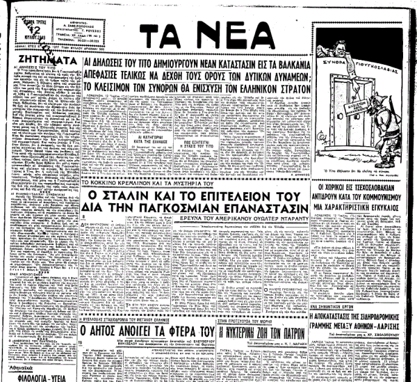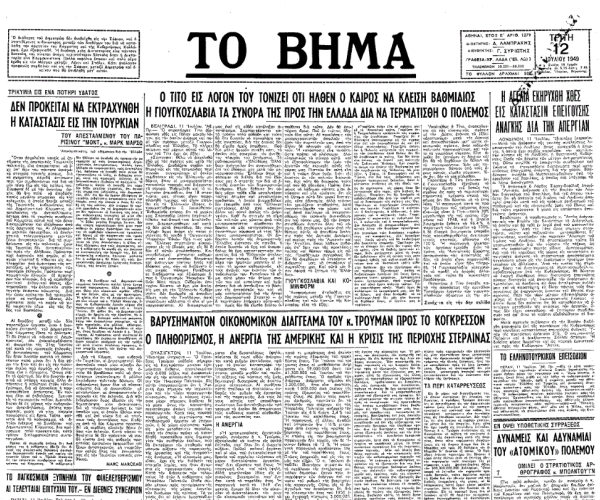 Το κύριο άρθρο στο πρωτοσέλιδο του «Βήματος» που είχε κυκλοφορήσει την Τρίτη 12 Ιουλίου 1949 έφερε τον ακόλουθο τίτλο: «Ο Τίτο εις λόγον του τονίζει ότι ήλθεν ο καιρός να κλείση βαθμιαίως η Γιουγκοσλαβία τα σύνορά της προς την Ελλάδα διά να τερματισθή ο πόλεμος». Ο μεν Τίτο (Γιόσιπ Μπροζ το πραγματικό όνομά του) ήταν ο περιβόητος στρατάρχης, τότε πρωθυπουργός και απόλυτος κυρίαρχος της Ομόσπονδης Λαϊκής Δημοκρατίας της Γιουγκοσλαβίας, ο δε πόλεμος ήταν ο διαβόητος Εμφύλιος, στον οποίο συγκρούονταν ανηλεώς οι δυνάμεις του Εθνικού Στρατού (ΕΣ) και του Δημοκρατικού Στρατού Ελλάδας (ΔΣΕ).
