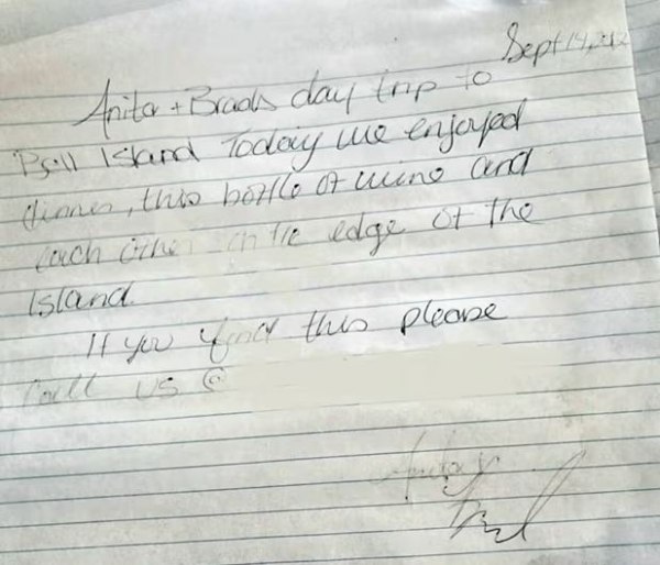 «Ημερήσια εκδρομή της Ανίτα και του Μπραντ στο νησί Μπελ. Σήμερα, απολαύσαμε το δείπνο, αυτό το μπουκάλι κρασί και ο ένας τον άλλον, στην άκρη του νησιού», ανέφερε. Το ζευγάρι ζητούσε απο όποιον θα έβρισκε το μήνυμα να τους καλέσει, παραθέτοντας έναν αριθμό τηλεφώνου.