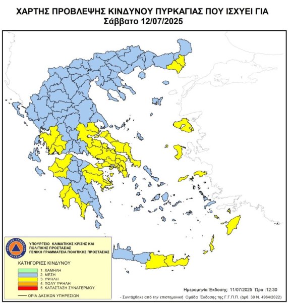 Στην κατηγορία κινδύνου 3 (υψηλός κίνδυνος πυρκαγιάς) κατατάσσονται σήμερα, Σάββατο 12 Ιουλίου, η Αττική, η Εύβοια, η Κορινθία, η Αργολίδα, η Μεσσηνία και άλλες περιοχές, σύμφωνα με τον Χάρτη Πρόβλεψης Κινδύνου Πυρκαγιάς της Γενικής Γραμματείας Πολιτικής Προστασίας του Υπουργείου Κλιματικής Κρίσης και Πολιτικής Προστασίας.