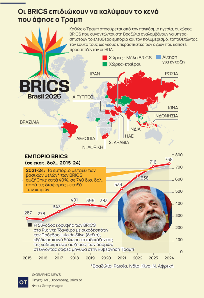 Καθώς ο Τραμπ αποξενώνει τους παραδοσιακούς συμμάχους και επιδιώκει την ατζέντα του «Πρώτα η Αμερική», οι BRICS επιδιώκουν να καταλάβουν το έδαφος που έχει παραχωρήσει ο Αμερικανός πρόεδρος. Το αποτέλεσμα είναι ότι οι BRICS, που επί μακρόν θεωρούνταν εναλλακτική λύση στην παγκόσμια τάξη υπό την ηγεσία των ΗΠΑ, τώρα προβάλλονται ως υπερασπιστές των ίδιων βασικών αξιών, συμπεριλαμβανομένου του ελεύθερου εμπορίου και της πολυμέρειας.