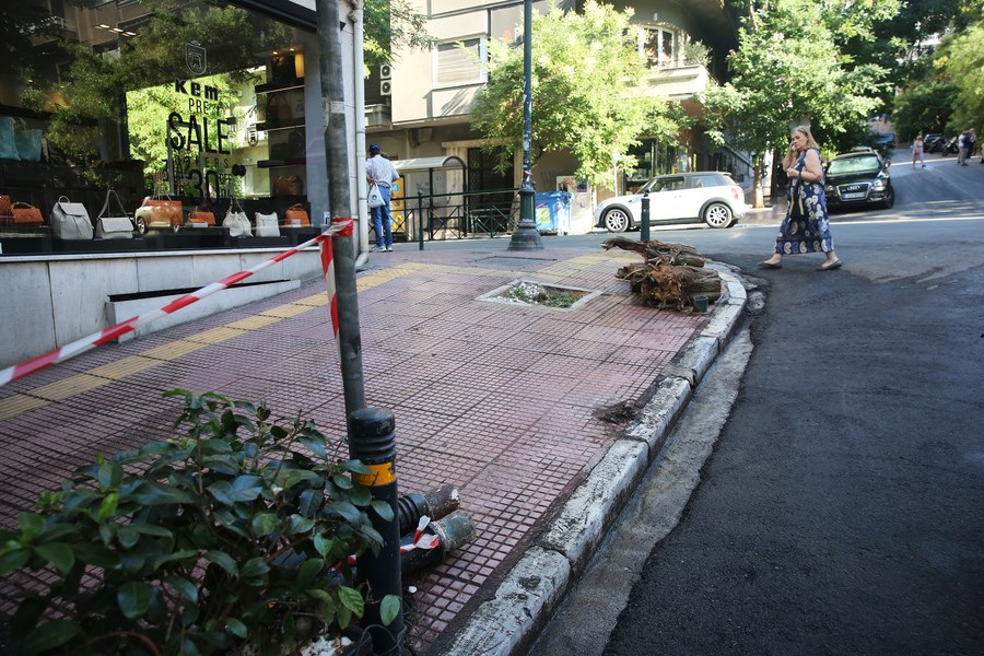 Φωτογραφία από το σημείο στη διασταύρωση Λουκιανού και Πατριάρχου Ιωακείμ στο Κολωνάκι, όπου έγινε το τροχαίο με το τζιπ.
