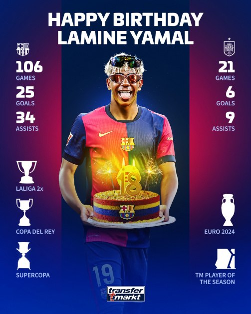 Μέρα γιορτής για τον Λαμίν Γιαμάλ που κλείνει σήμερα 18 χρόνια ζωής. Ένα παιδί ευλογημένο με άφθονο ταλέντο που του έχει προσφέρει ήδη την δυνατότητα να φτιάξει την ζωή του και όλης της οικογένειας του μαζί με τα οικονομικά οφέλη που ήδη καρπώνεται και βεβαίως να έχει μπροστά του μια καριέρα που ίσως ξεπεράσει τους πάντες στην ιστορία του ποδοσφαίρου. Αν σκεφτούμε μόνο πως πριν καν κλείσει τα 18 του χρόνια έχει πετύχει ασύλληπτα πράγματα, ομαδικά και ατομικά γίνεται εύκολα αντιληπτό πως έχει την δυνατότητα να σπάσει όλα τα ρεκόρ.