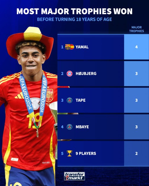 Όπως φαίνεται στο αναλυτικό αφιέρωμα από το transfermarkt ο Λαμίν Γιαμάλ έχει μια εντυπωσιακή πρωτιά στον αιώνα που διανύουμε. Βρίσκεται στην πρώτη θέση παγκοσμίως με τους περισσότερους σημαντικούς τίτλους για παίκτη κάτω των 18 ετών καθώς έχει ήδη τέσσερις στο ενεργητικό του, δύο πρωταθλήματα Ισπανίας, ένα Euro και ένα Κύπελλο.