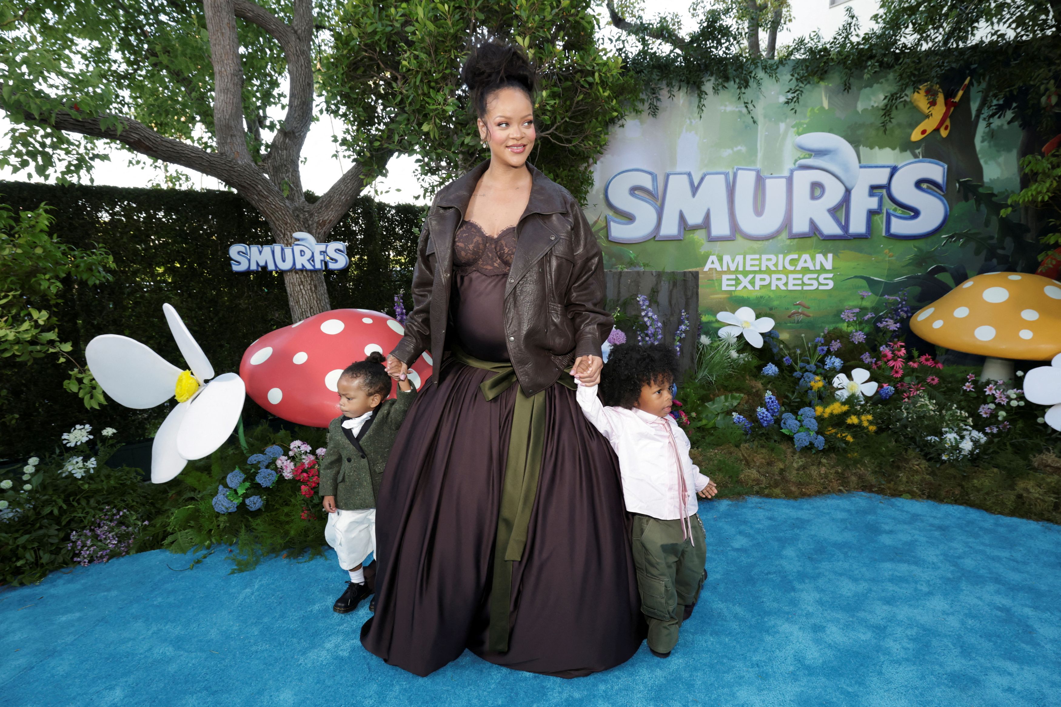 Η Ριάνα, συνοδευόμενη από τους δύο γιους της περπάτησε στο κόκκινο χαλί των Paramount Pictures Studios, με αφορμή την πρεμιέρα της νέας ταινίας κινουμένων σχεδίων «The Smurfs», στην οποία δανείζει τη φωνή της στη Στρουμφίτα