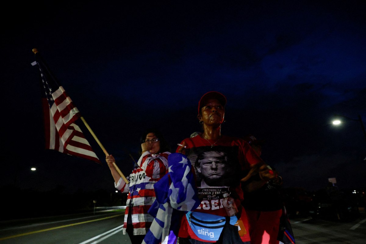 Ένα άτομο κρατά την αμερικανική σημαία μετά τον τραυματισμό του υποψηφίου για την προεδρία των Ρεπουμπλικάνων και πρώην προέδρου των ΗΠΑ Ντόναλντ Τραμπ, όταν πυροβολήθηκε κατά τη διάρκεια προεκλογικής συγκέντρωσης που πραγματοποιήθηκε στο Μπάτλερ, έξω από το θέρετρο Mar-a-Lago του Τραμπ στο Παλμ Μπιτς της Φλόριντα, στις 13 Ιουλίου 2024.