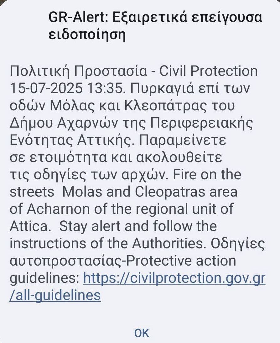 Μάλιστα έχει σταλεί μήνυμα 112 στους κατοίκους στις Αχαρνές, προκειμένου να βρίσκονται σε ετοιμότητα και να παρακολουθούν τις νεότερες ενημερώσεις από την Πυροσβεστική Υπηρεσία.