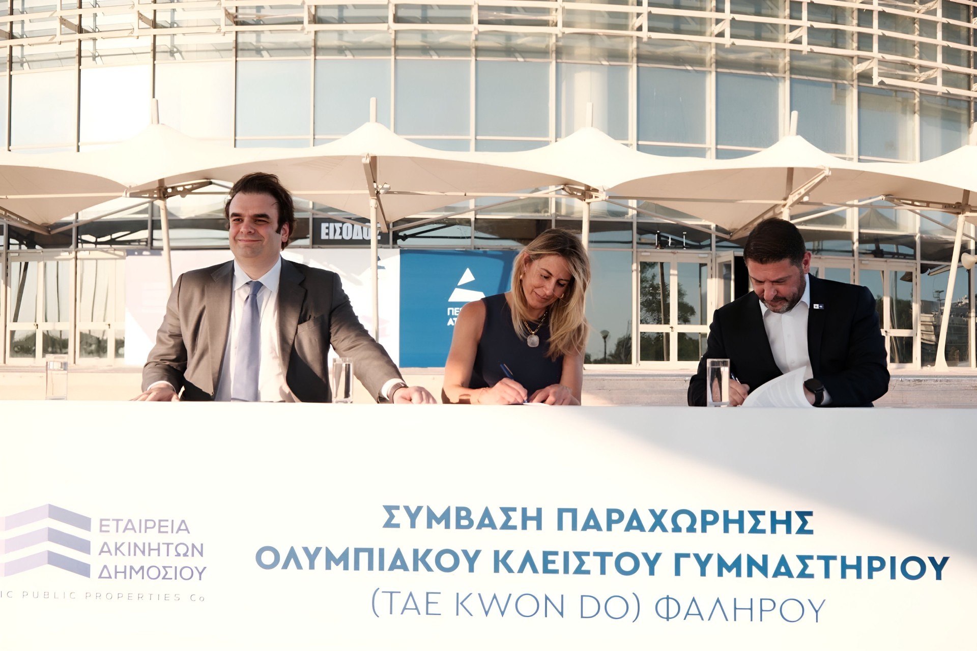 Τη σύμβαση για την παραχώρηση του Κλειστού Ολυμπιακού Γηπέδου Φαλήρου Tae Kwon Do στην Περιφέρεια Αττικής υπέγραψαν χθες ο Περιφερειάρχης Νίκος Χαρδαλιάς και η Διευθύνουσα Σύμβουλος της Εταιρείας Ακινήτων Δημοσίου Ηρώ Χατζηγεωργίου, παρουσία του Υπουργού Εθνικής Οικονομίας και Οικονομικών Κυριάκου Πιερρακάκη.