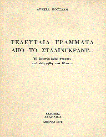 Ο άνθρωπος μέσα σε εξηντατέσσερις σελίδες. Τον βλέπω στα «Τελευταία Γράμματα από το Στάλινγκραντ», που παρουσιάζουν οι εκδόσεις «Ασκραίος» σε μετάφραση του κ. Αλ. Ζωγράφου.