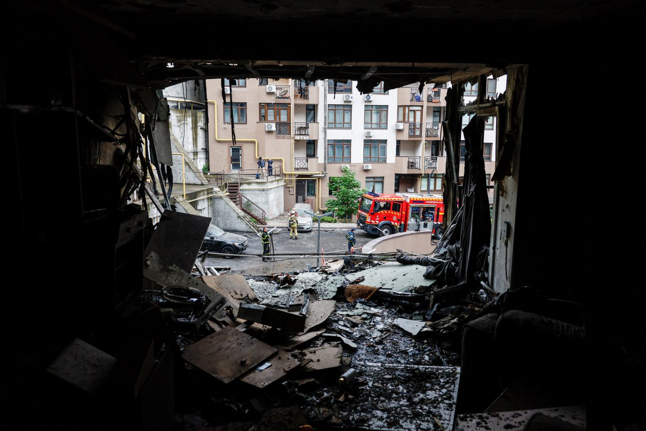 Σε ένα από τα σημεία που επλήγησαν, οι κάτοικοι, συγχυσμένοι, στέκονταν μέσα σε σπασμένα γυαλιά και καψαλισμένους τοίχους, κοιτάζοντας τις ζημιές που προκλήθηκαν όταν drone χτύπησε τους κάτω ορόφους μιας πολυκατοικίας.