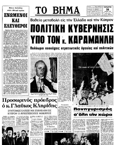 «Ο στρατηγός Φαίδων Γκιζίκης, Πρόεδρος της Ελλάδος, προσεκάλεσε τον πρώην πρωθυπουργό κ. Κωνσταντίνο Καραμανλή όπως τερματίση την εξορίαν του εις Παρισίους και επανέλθη εις την Ελλάδα ως πρωθυπουργός, ανεκοίνωσε, σήμερον Τρίτην, το γραφείον του κ. Καραμανλή. Το γραφείον του κ. Καραμανλή είπεν ότι ούτος θα ηγηθή κυβερνήσεως Εθνικής Ενότητος. Ο απαντών εις το τηλέφωνον του κ. Καραμανλή είπεν ότι ο πρώην πρωθυπουργός έχει ήδη αναχωρήσει από το διαμέρισμά του, επιστρέφων εις Αθήνας. Είπεν ότι δεν γνωρίζει λεπτομερείας της πτήσεως».