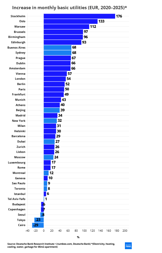 Τα τελευταία πέντε χρόνια, από το 2020 έως το 2025, το μηνιαίο κόστος των βασικών υπηρεσιών κοινής ωφέλειας σε ευρώ έχει αυξηθεί σημαντικά σε πολλές ευρωπαϊκές πόλεις. Η Στοκχόλμη βρίσκεται στην κορυφή της λίστας με αύξηση 176%, ακολουθούμενη από μια άλλη σκανδιναβική πόλη, το Όσλο, με 133%.