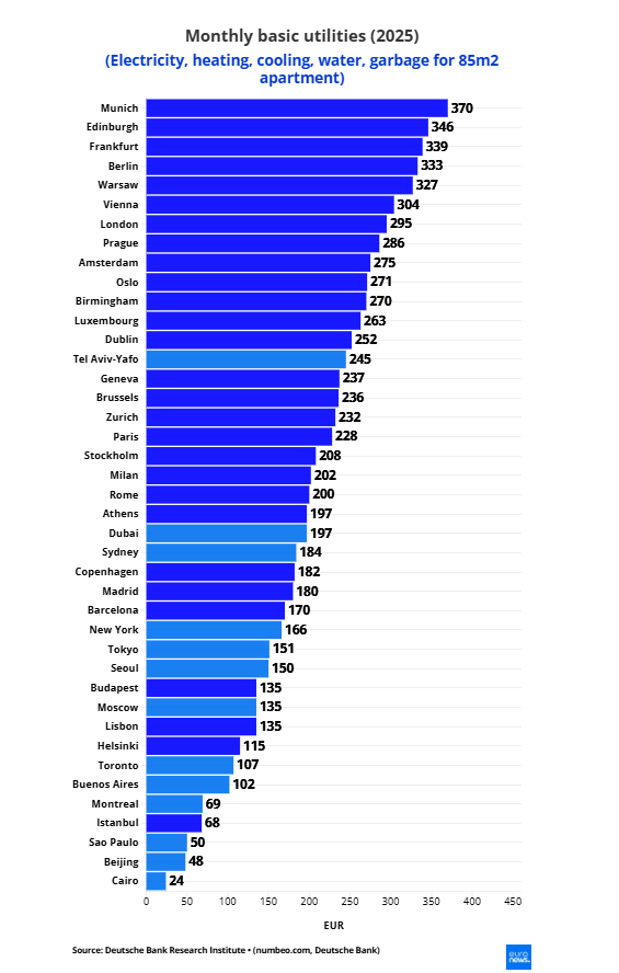 Σύμφωνα με την έκθεση Mapping the World’s Prices της Deutsche Bank , την οποία παρουσιάζει το Euronews Business, η οποία καλύπτει 67 πόλεις παγκοσμίως, συμπεριλαμβανομένων 28 στην Ευρώπη, το βασικό κόστος κοινής ωφέλειας το 2025 διαφέρει σημαντικά σε ολόκληρη την ήπειρο. Οι μηνιαίες βασικές δαπάνες κοινής ωφέλειας περιλαμβάνουν ηλεκτρικό ρεύμα, θέρμανση, ψύξη, νερό και απορρίμματα για ένα διαμέρισμα 85 τ.μ.