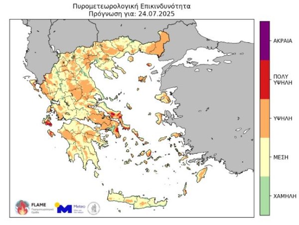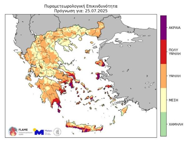 Από σήμερα έως και το Σάββατο 26 Ιουλίου αναμένεται ενίσχυση των βόρειων/βορειοανατολικών ανέμων στην ανατολική ηπειρωτική χώρα και το Αιγαίο, γεγονός που θα οδηγήσει σε σημαντική ενίσχυση του δυναμικού για πυρκαγιές καθοδηγούμενες από τον άνεμο (κυρίως την Παρασκευή 25 και το Σάββατο 26 Ιουλίου 2025).