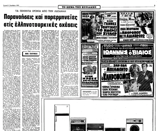 *Άρθρο του αξιομνημόνευτου δημοσιογράφου και συγγραφέα Μανούσου Πλουμίδη (1913-1981), που έφερε τον τίτλο «Παρανοήσεις και παρερμηνείες στις ελληνοτουρκικές σχέσεις» και είχε δημοσιευτεί στην εφημερίδα «Το Βήμα» την Κυριακή 4 Νοεμβρίου 1973. Το έτος εκείνο συμπληρώνονταν πενήντα χρόνια αφενός από την υπογραφή της Συνθήκης της Λωζάννης και αφετέρου από την ίδρυση της Τουρκικής Δημοκρατίας.