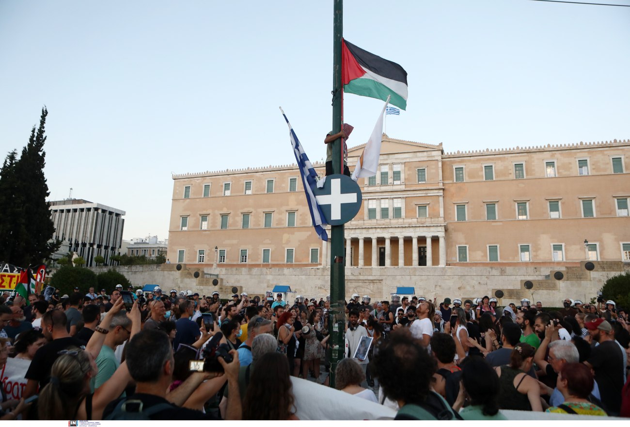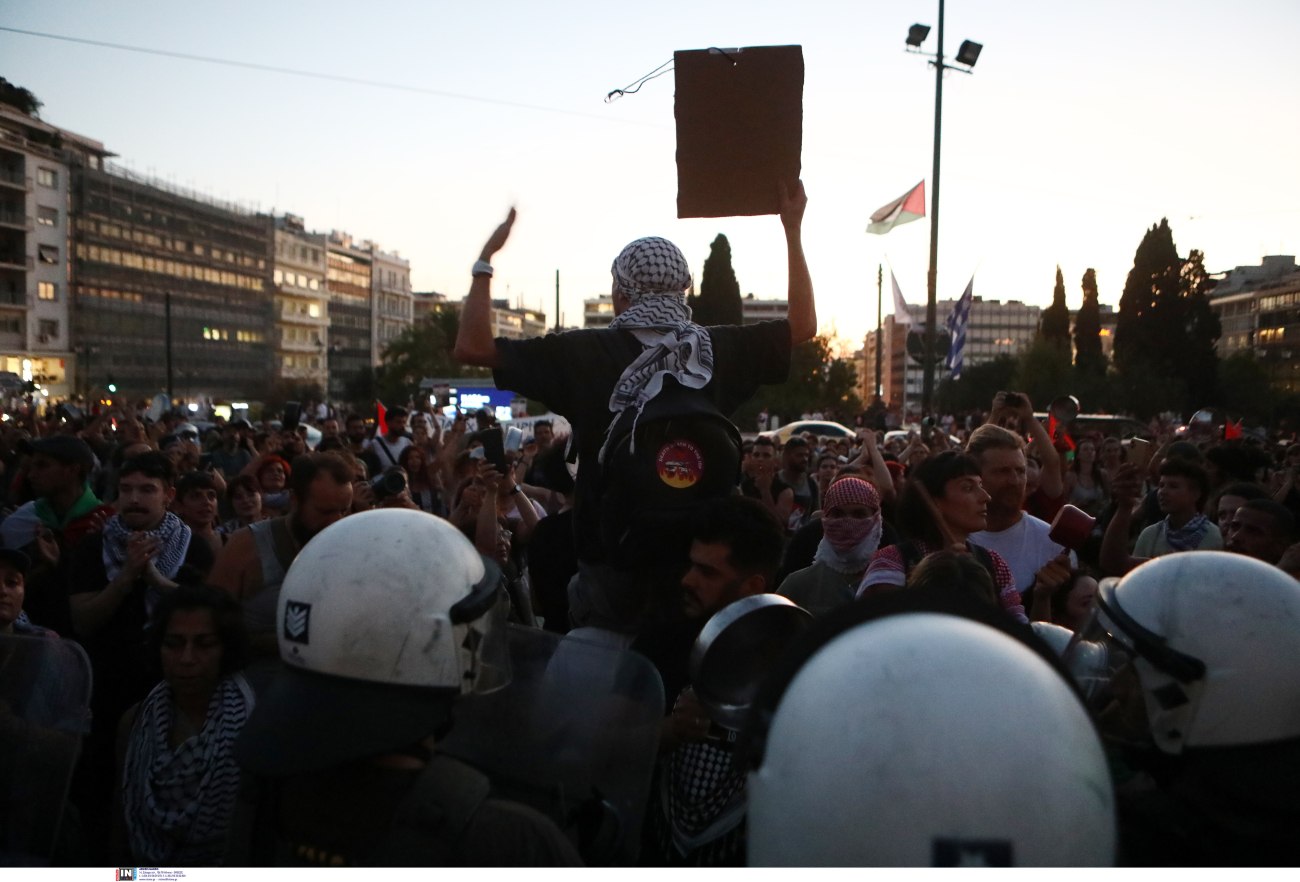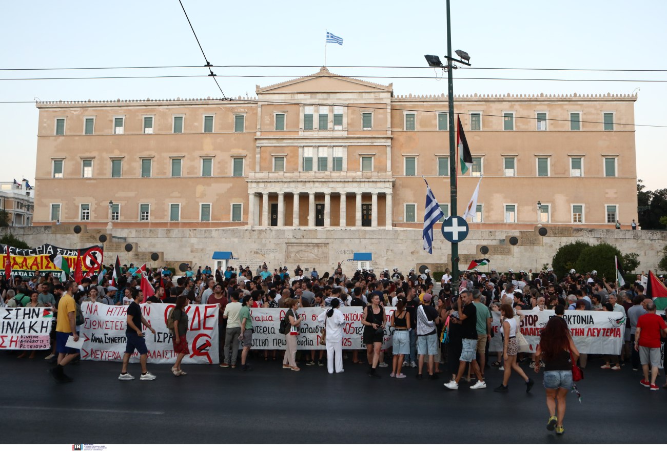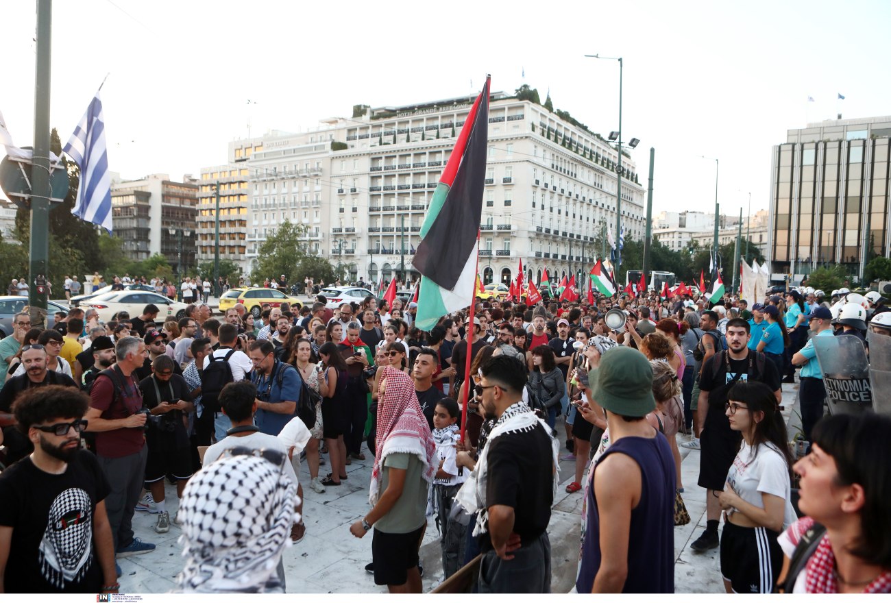 Στο Σύνταγμα είχαν μαζευτεί από πριν τις 20:00 εκατοντάδες κόσμου που αψήφησαν τον καύσωνα, με άδειες κατσαρόλες στα πλαίσια καλεσμάτων του March to Gaza, του Gaza Is Here – Initiative Against Genocide, κομμάτων και φοιτητών.