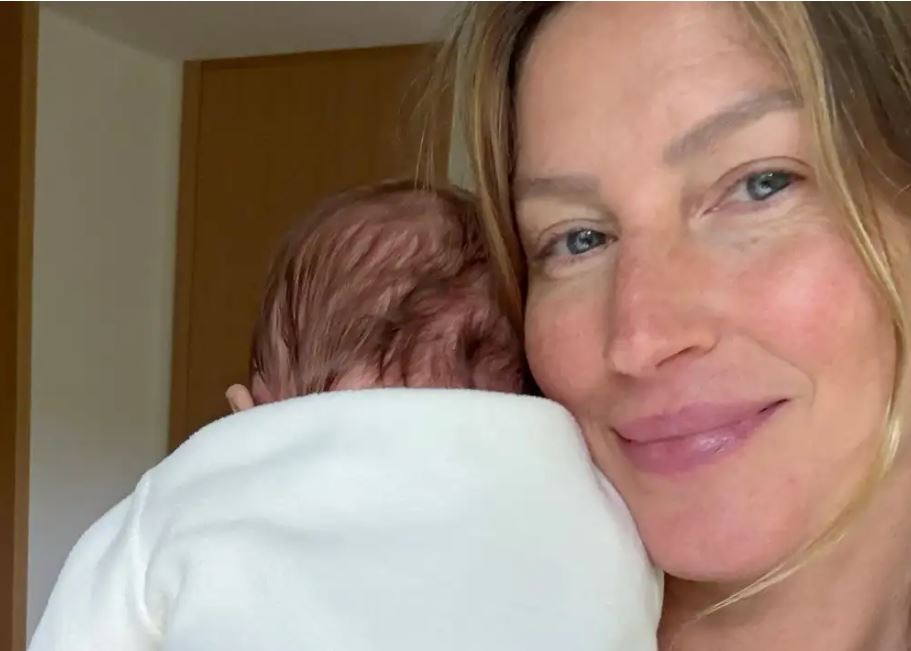 Η Ζιζέλ, στο τρυφερό στιγμιότυπο κρατάει τον γιο της στην αγκαλιά της, ενώ κάθεται σε έναν καναπέ σε εξωτερικό χώρο.