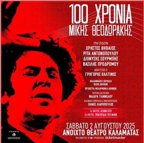 Μία σπουδαία μουσική βραδιά με τη μουσική του Μίκη Θεοδωράκη, σε μια συναυλία-αφιέρωμα που σκοπό έχει να τιμήσει έναν από τους κορυφαίους δημιουργούς του ελληνικού πολιτισμού.