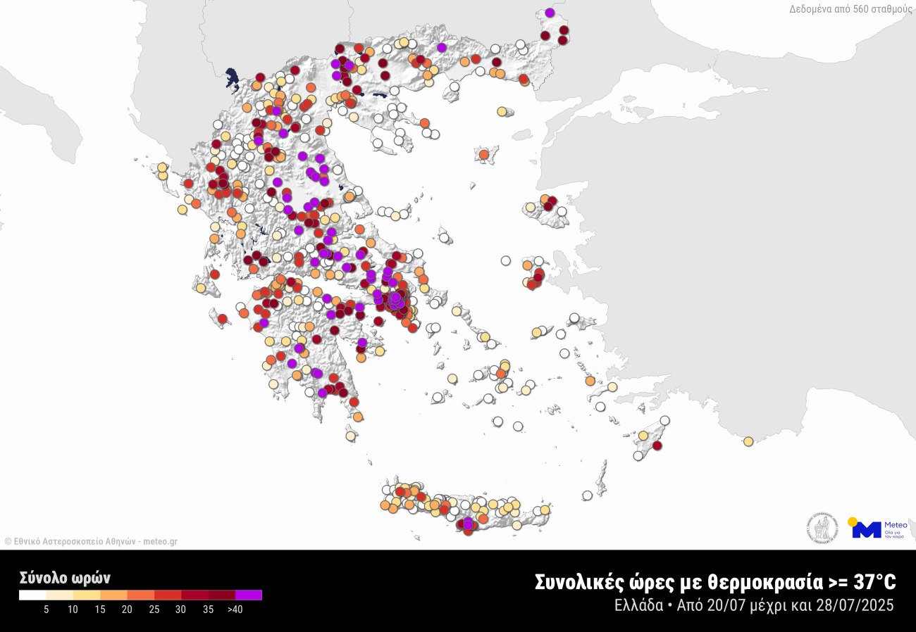 Σε όλες τις παραπάνω περιοχές, αθροιστικά, την περίοδο 20 με 28 Ιουλίου, καταγράφηκαν 40 ώρες με θερμοκρασίες πάνω από 37 βαθμούς Κελσίου».
