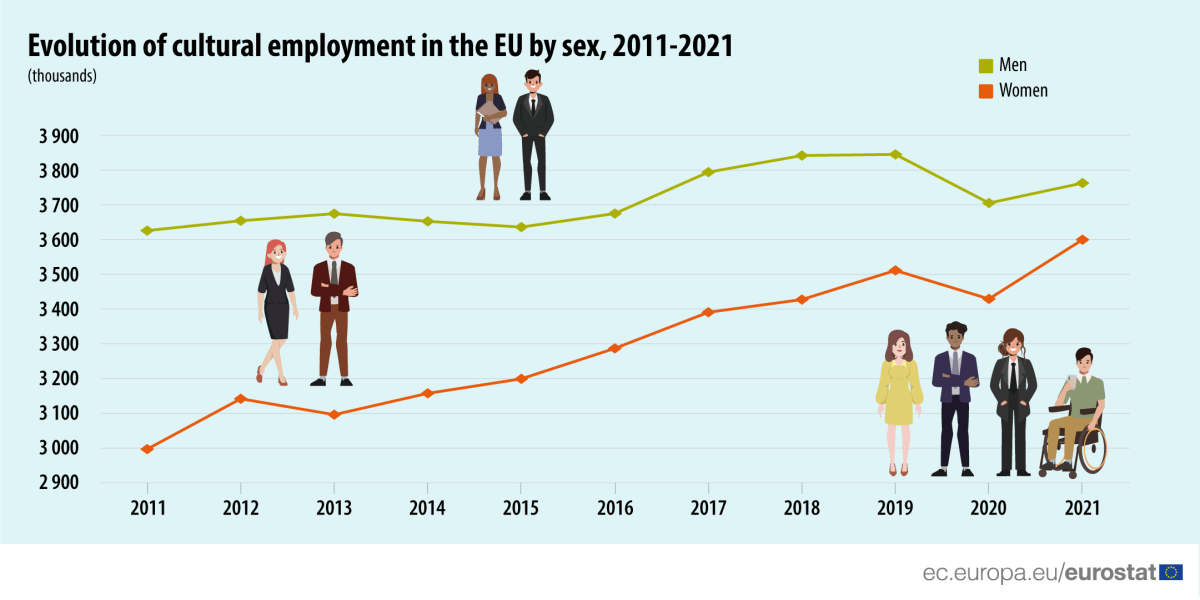 Σε 16 χώρες της Ευρωπαϊκής Ένωσης, το ποσοστό των γυναικών στην απασχόληση στον πολιτιστικό τομέα υπερέβη αυτό των ανδρών. Μεταξύ αυτών, η Λετονία και η Εσθονία παρουσίασαν τις μεγαλύτερες διαφορές, με 32,6 ποσοστιαίες μονάδες και 24,2 ποσοστιαίες μονάδες, αντίστοιχα, υπέρ των γυναικών.
