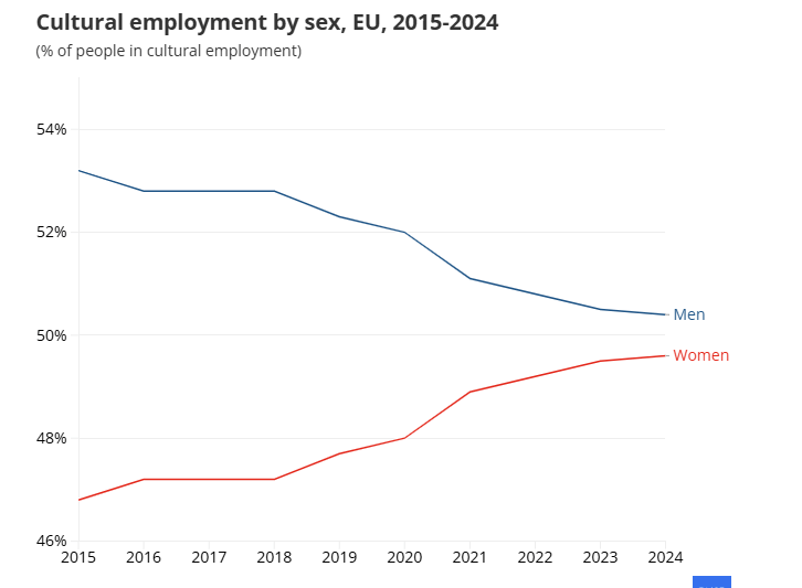 Το χάσμα μεταξύ των φύλων στην απασχόληση στον πολιτιστικό τομέα της ΕΕ μειώθηκε από 6,4 ποσοστιαίες μονάδες το 2015 σε 0,8 ποσοστιαίες μονάδες το 2024, σύμφωνα με τα τελευταία στοιχεία της Eurostat.