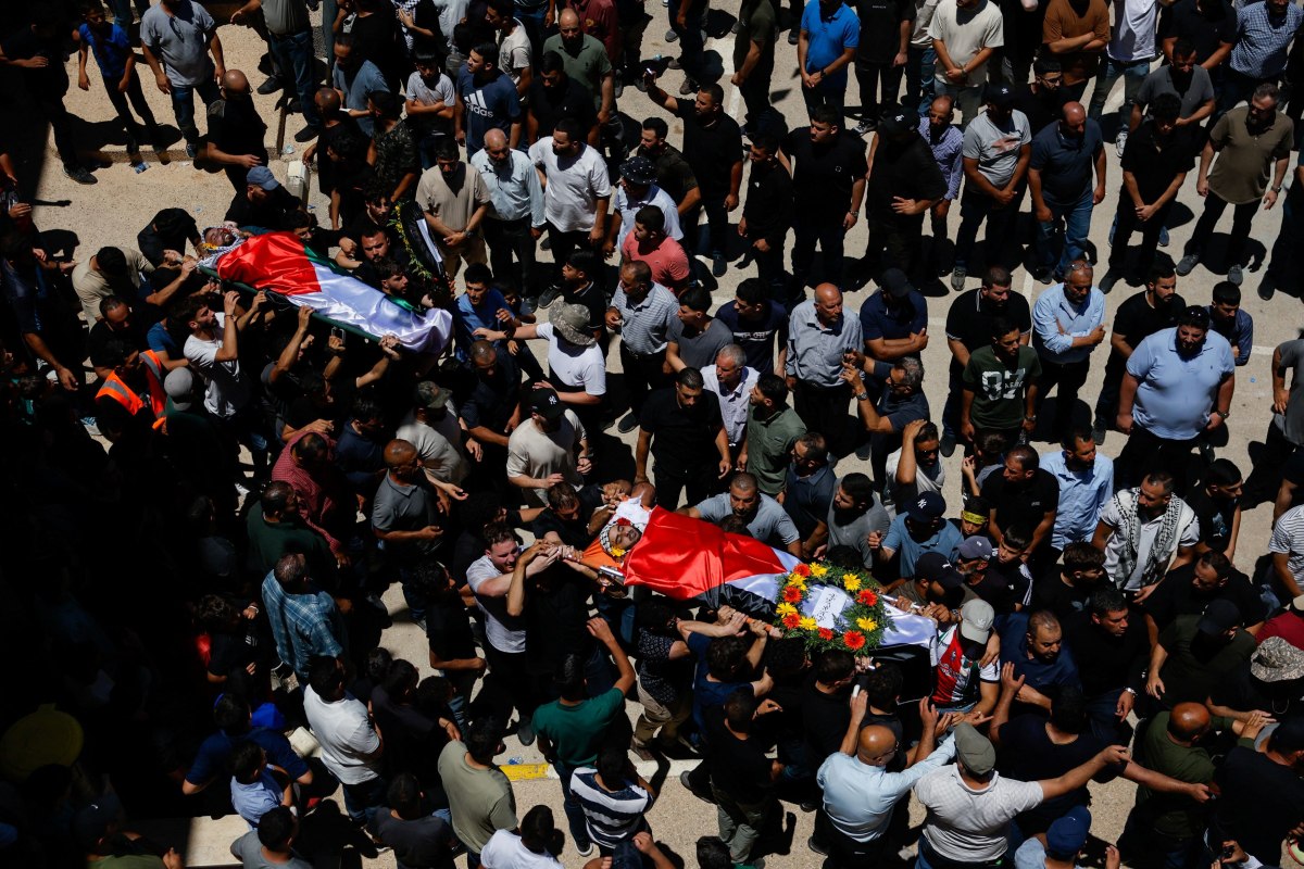 Άνθρωποι μεταφέρουν τα σώματα του Σαϊφολά Καμέλ Μουσάλλετ, ενός Παλαιστινίου-Αμερικανού που ξυλοκοπήθηκε μέχρι θανάτου από εποίκους, και του Μοχάμαντ Αλ-Σαλάμπι, ενός άνδρα που πυροβολήθηκε θανάσιμα από τις ισραηλινές δυνάμεις, σύμφωνα με το Παλαιστινιακό Υπουργείο Υγείας, κατά τη διάρκεια της κηδείας τους κοντά στη Ραμάλα, στην κατεχόμενη από το Ισραήλ Δυτική Όχθη, στις 13 Ιουλίου 2025.