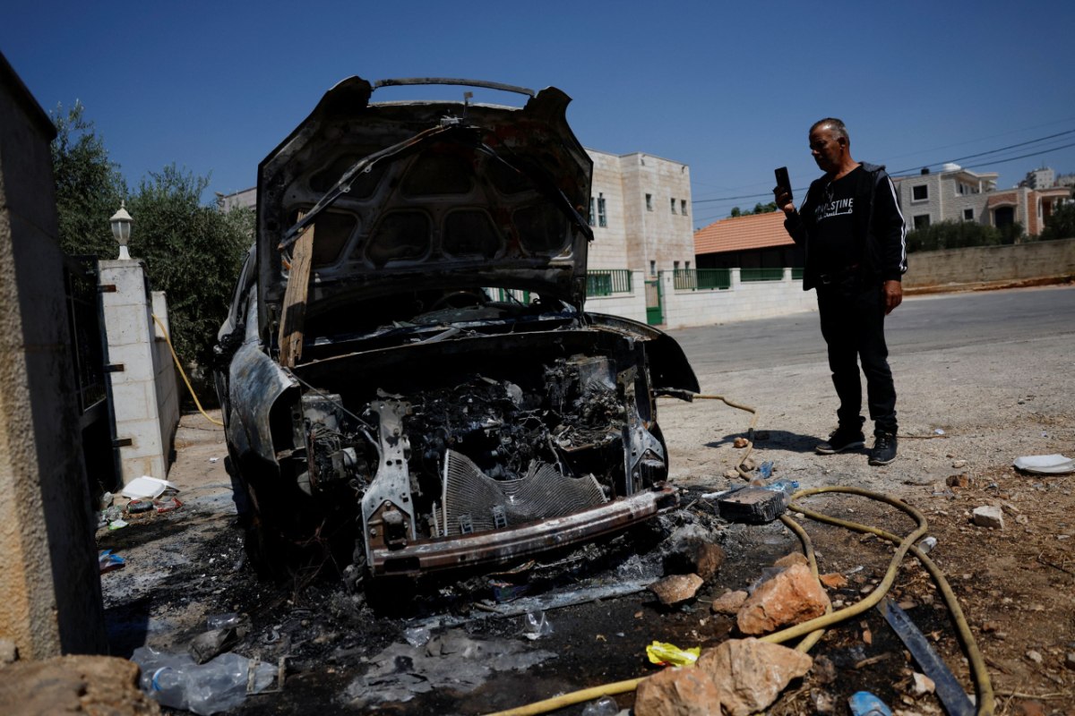 Παλαιστίνιος άνδρας επιθεωρεί ένα καμένο αυτοκίνητο μετά από επίθεση ισραηλινών εποίκων στο χωριό Σιλουάντ, κοντά στη Ραμάλα, στην κατεχόμενη από το Ισραήλ Δυτική Όχθη, στις 31 Ιουλίου 2025.