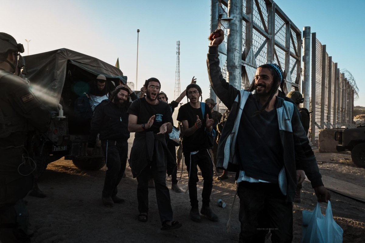 Ισραηλινοί έποικοι και ακτιβιστές της δεξιάς γιορτάζουν μετά την παραβίαση του φράγματος γύρω από τη Λωρίδα της Γάζας. Ορισμένοι έστησαν συμβολικά φυλάκια πριν τελικά τους εκδιώξουν οι ισραηλινές δυνάμεις
