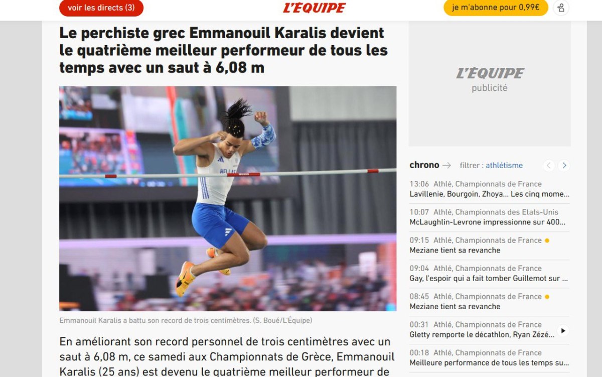 Η γαλλική L’Équipe δίνει ιδιαίτερη και πολύ τιμητική αναφορά στο επίτευγμα του Εμμανουήλ Καραλή, υπογραμμίζοντας ότι «με άλμα στα 6,08μ. κατά τους Πανελλήνιους αγώνες στη Βόλο στις 2 Αυγούστου 2025, ο Έλληνας πρωταθλητής ανέβηκε στην τέταρτη θέση της παγκόσμιας κορυφαίας λίστας όλων των εποχών.