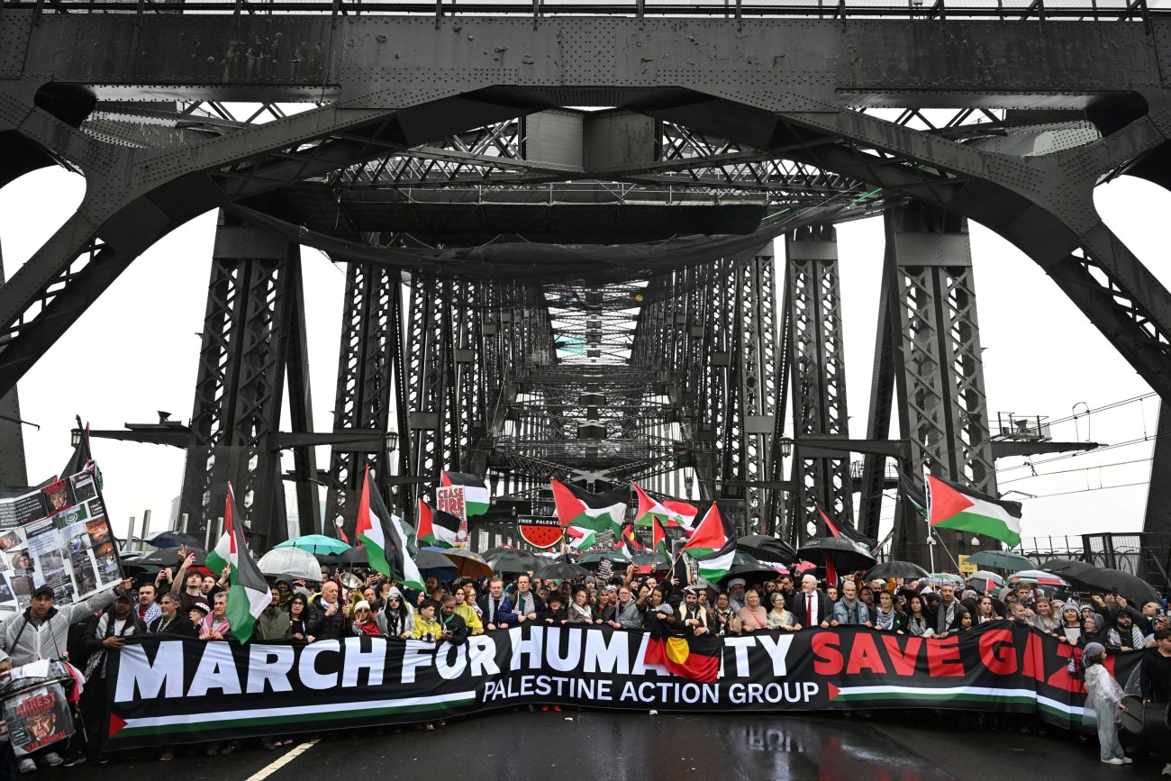 Τουλάχιστον 100.000 διαδηλωτές υπέρ της Παλαιστίνης, μεταξύ των οποίων και ο Τζούλιαν Ασάνζ, ο πρώην υπουργός Εξωτερικών Μπομπ Καρ και ο βουλευτής της κυβέρνησης Εντ Χούσικ, διαδήλωσαν κάτω από τη βροχή στη γέφυρα του λιμανιού του Σίδνεϊ για να διαμαρτυρηθούν για τα εγκλήματα του Ισραήλ στη Γάζα και να εκφράσουν την κατακραυγή τους για τα παιδιά που πεθαίνουν από την πείνα στον θύλακα.