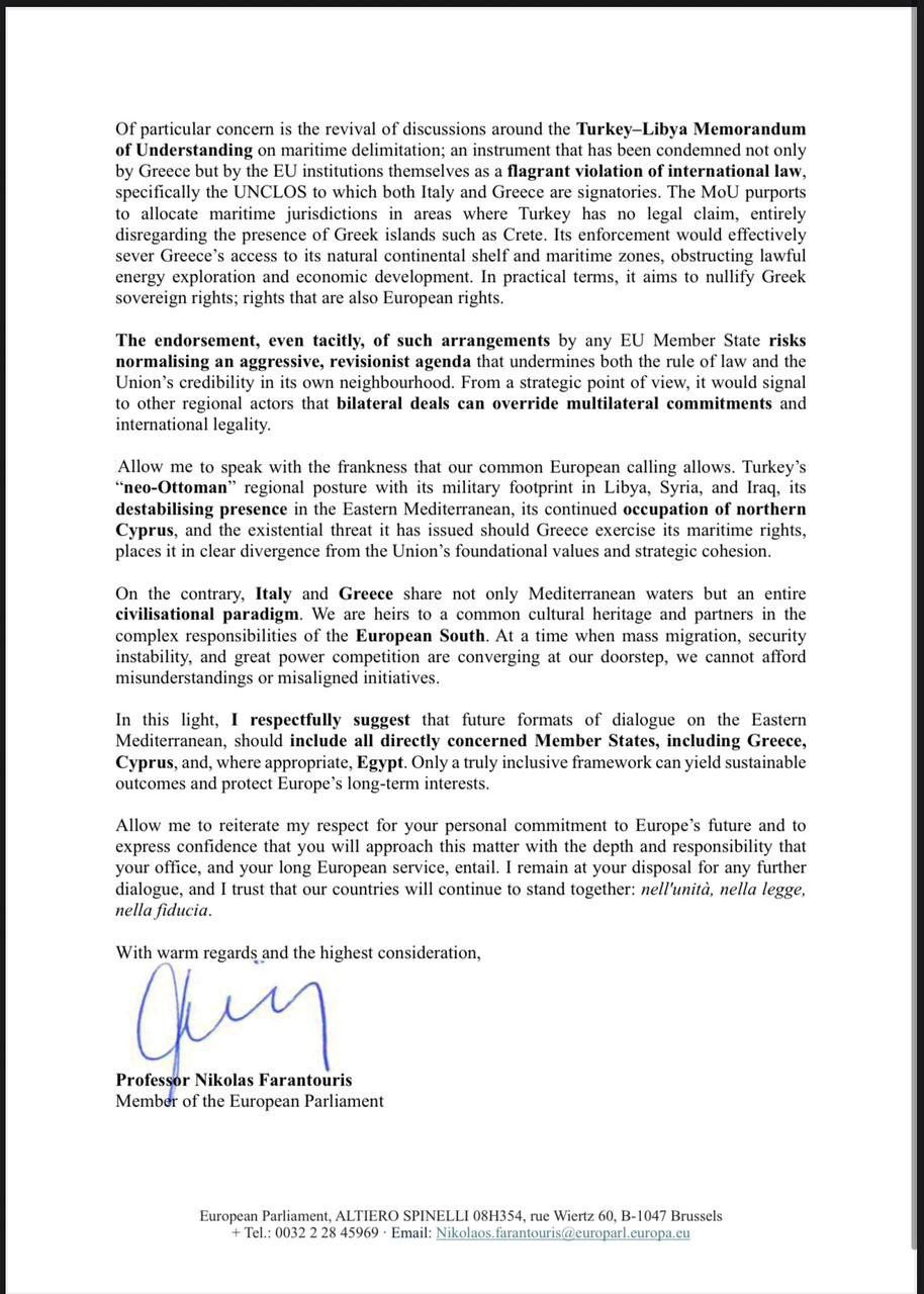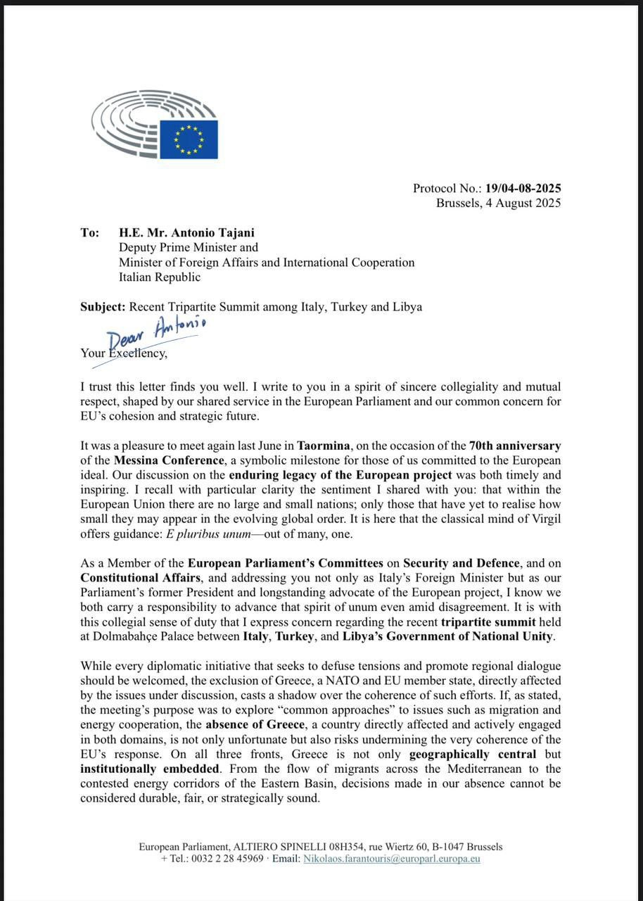 Όπως επισημαίνει στην επιστολή του ο Νικόλας Φαραντούρης, «στην τριεθνή Ιταλίας -Τουρκίας -Λιβύης η Ελλάδα αγνοήθηκε και αυτό δεν μπορεί να περάσει απαρατήρητο».
