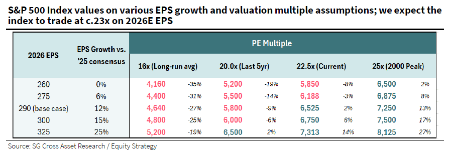Για το τέλος του 2026, η SG προβλέπει στόχο 6.900 μονάδων, που συνεπάγεται περαιτέρω άνοδο κατά 9%, ενώ δεν αποκλείει υπέρβαση προς τις 7.300 μονάδες στο πρώτο εξάμηνο του έτους (με πολλαπλασιαστή 22x στα εκτιμώμενα κέρδη 2027, 333 δολ./μετοχή). Κρίσιμοι παράγοντες για τις αποδόσεις είναι η νομισματική πολιτική της Fed και η πορεία του δολαρίου.