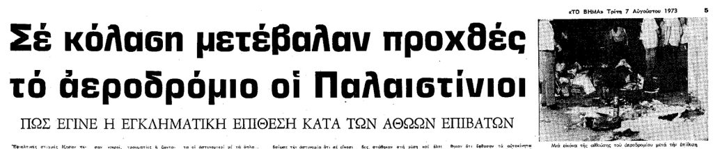 Στις 5 Αυγούστου 1973, δύο μέλη της ένοπλης παλαιστινιακής οργάνωσης «Μαύρος Σεπτέμβρης» πραγματοποιούν τυφλή επίθεση, ανοίγοντας πυρ στο αεροδρόμιο του Ελληνικού έχοντας ως στόχο επιβάτες που ανέμεναν να επιβιβαστούν σε πτήση της TWA με προορισμό τη Νέα Υόρκη.