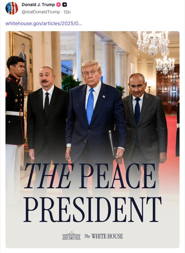Τέλος, όπως σημειώνει ο ίδιος, «παραμονές της προεδρίας του σε μια ειρηνευτική συμφωνία με αμερικανική μεσολάβηση μεταξύ Αζερμπαϊτζάν και Αρμενίας αυτή την εβδομάδα, ο Τραμπ ανάρτησε στα μέσα κοινωνικής δικτύωσης για να προβάλει τον ρόλο του: «Πολλοί ηγέτες προσπάθησαν να τερματίσουν τον πόλεμο, χωρίς επιτυχία, μέχρι τώρα, χάρη στον ‘ΤΡΑΜΠ’.».