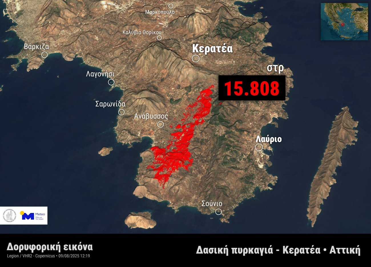 Σύμφωνα με την ανάλυση των δορυφορικών δεδομένων του ευρωπαϊκού μηχανισμού Copernicus EMS, έως και τις 12:19 του Σαββάτου 9 Αυγούστου 2025 είχαν καεί περίπου 15.808 στρέμματα δασικών και χορτολιβαδικών εκτάσεων στις περιοχές μεταξύ Κερατέας και Αναβύσσου. Ο καπνός είχε καλύψει τον ουρανό της Αττικής.
