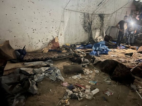 Η σκηνή στην οποία διέμεναν οι δημοσιογράφοι, μετά το δολοφονικό πλήγμα του ισραηλινού στρατού (φωτογραφία Reuters/Ebrahim Hajjaj)