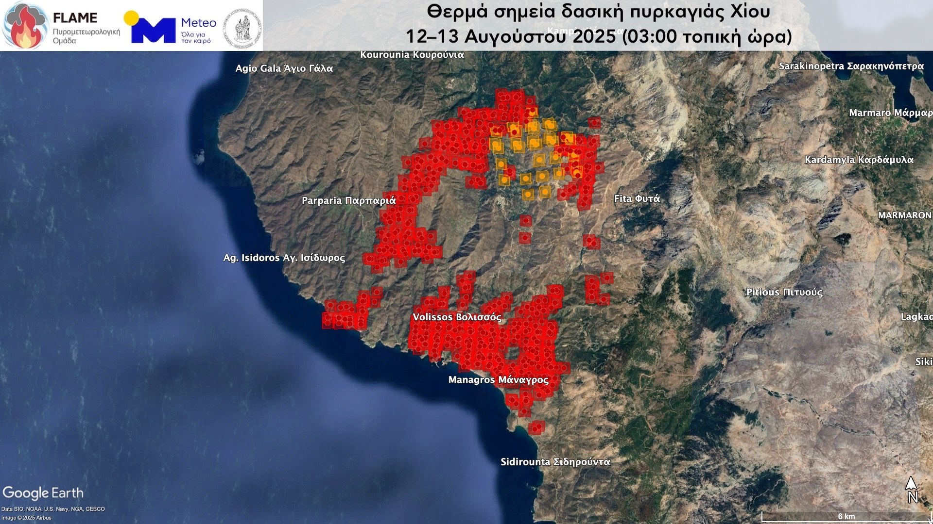 Σχεδόν 100.000 στρέμματα εκτάσεων έχουν επηρεαστεί από τις πυρκαγιές του τελευταίου διημέρου, 12 – 13 Αυγούστου ώς τις 03:00-, όπως αποτυπώνονται τα θερμά σημεία που ανίχνευσε το όργανο VIIRS (Visible Infrared Imaging Radiometer Suite) των δορυφόρων πολικής τροχιάς SUOMI, NOAA-20 και NOAA-21.